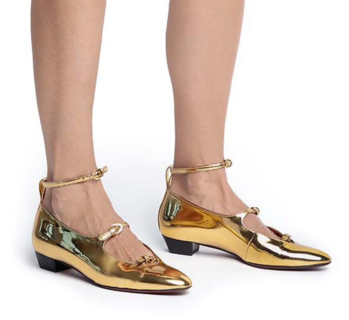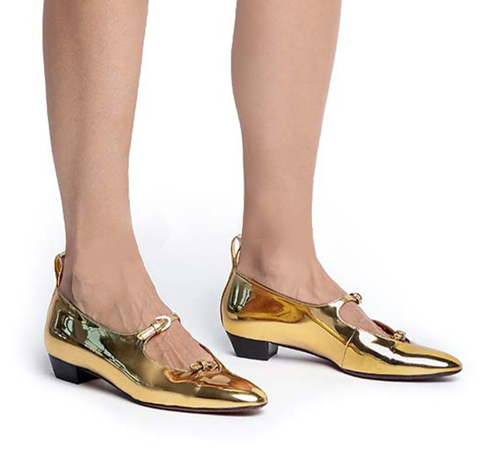 Made from Italian specchio leather, renowned for its reflective qualities make each piece truly one-of-a-kind. Due to its metallic nature, the leather may develop wrinkles with frequent use, which is a natural part of its unique patina. To keep your shoes looking their best, avoid alcohol-based products and clean gently with a soft, damp cloth, drying them immediately. While the metallic finish may age over time, it only adds to the leather’s character and charm.